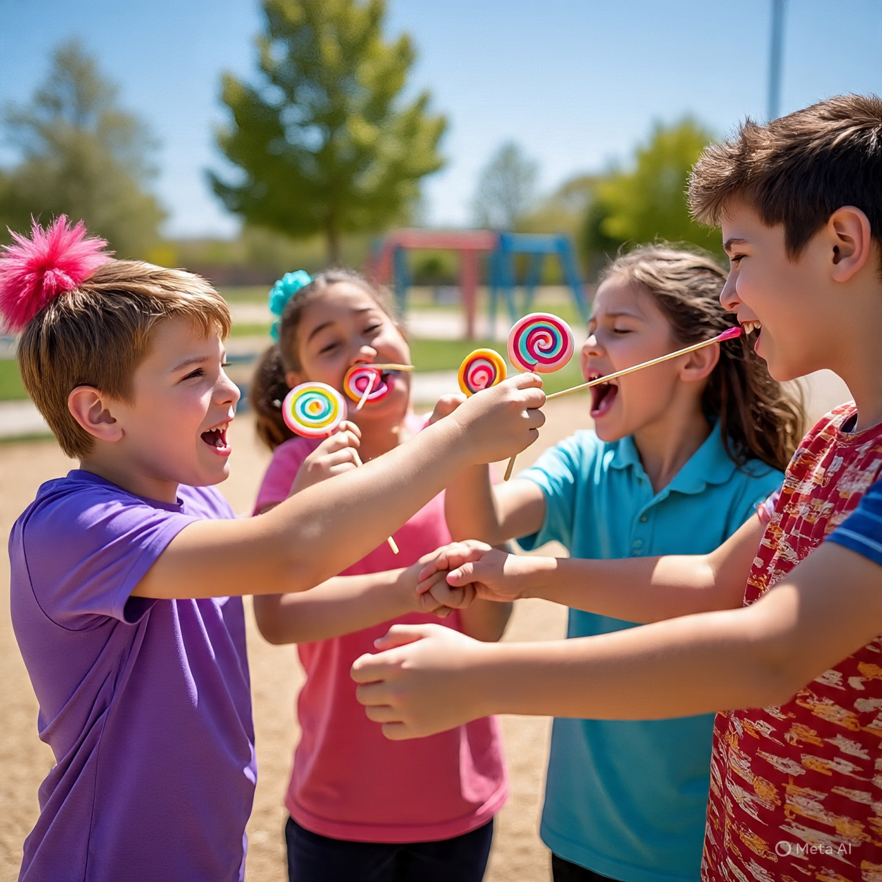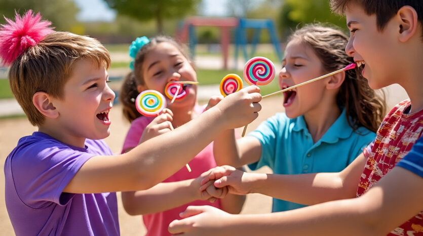 When the leader gives the signal, each participant must put the lollipop in their mouth. However, no one is allowed to bend their arm.