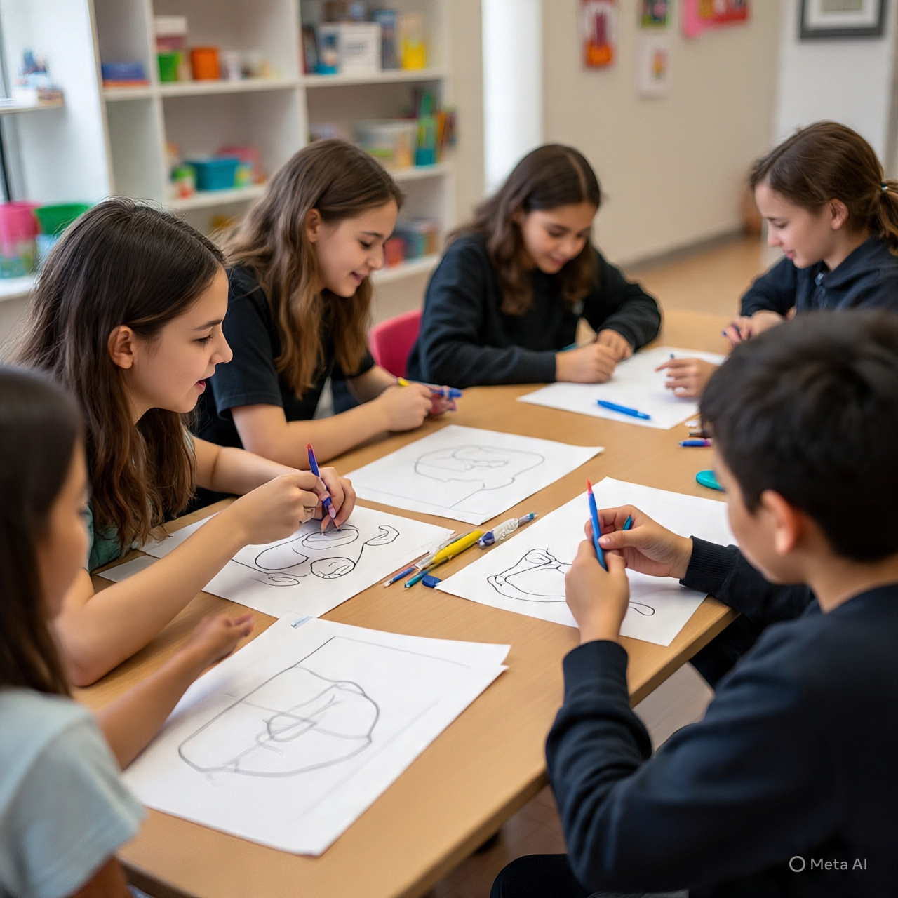 Next, on another sheet of paper, they are asked again to draw the parts of the human body—this time working as a group. They must organize themselves, deciding who will draw each part.