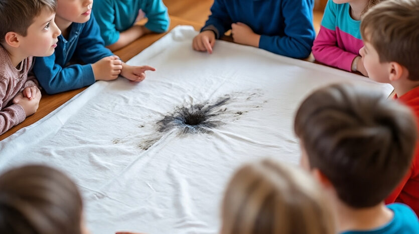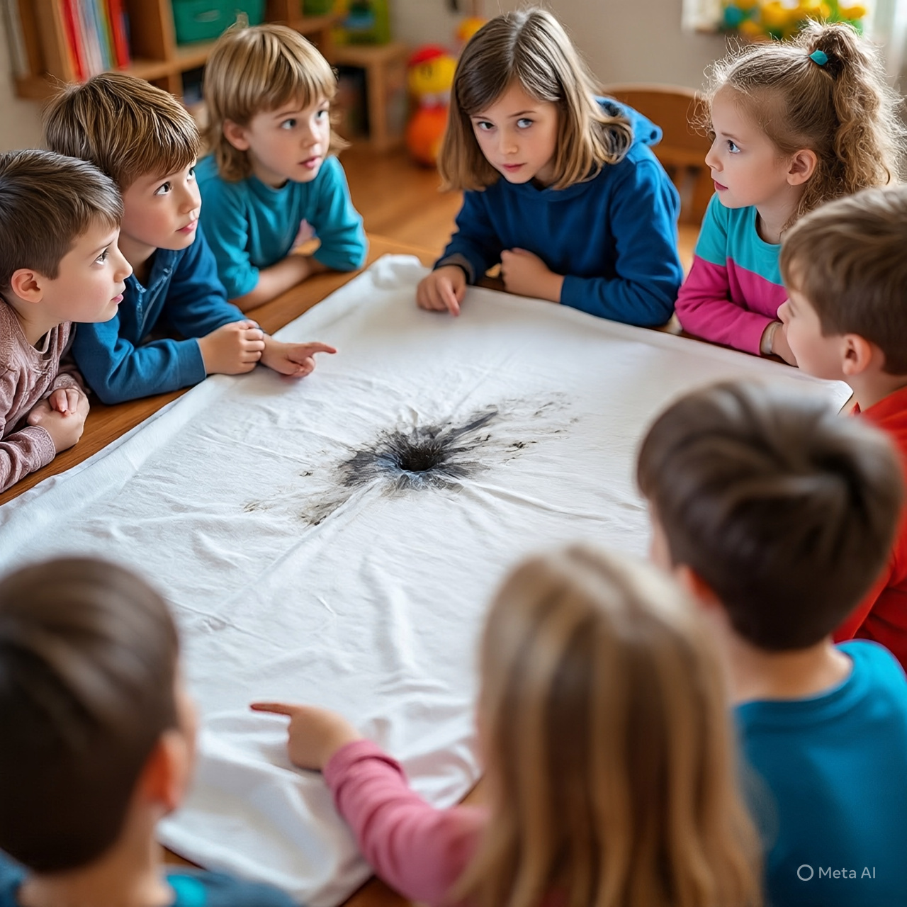 The coordinator asks for the participants’ attention and shows the group the white sheet with a small spot or stain in the center.